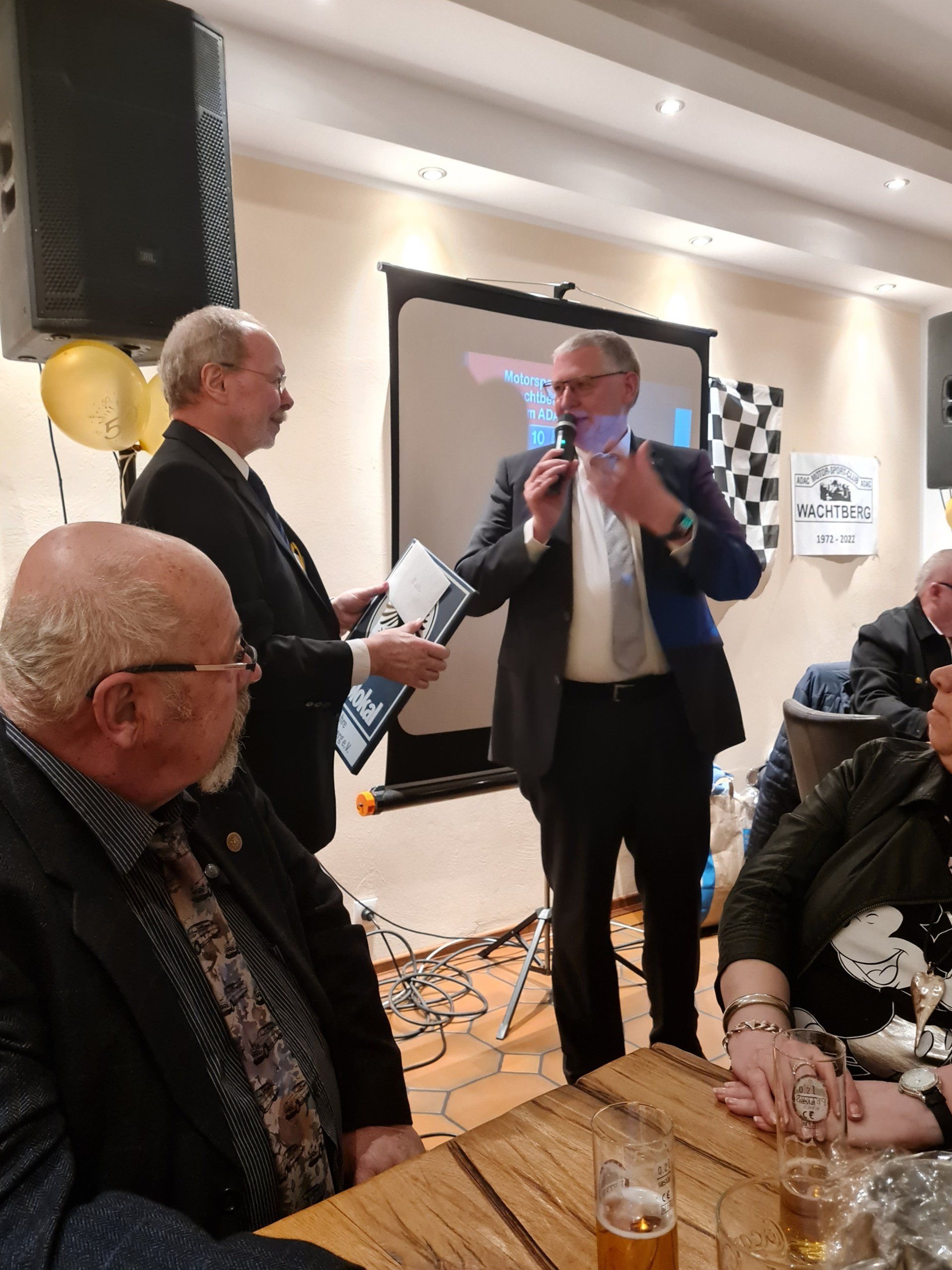 Im Namen des ADAC überreichte Walter Hornung neben zahlreichen Glückwünschen ein Wappen für das Clublokal des MSC- Wachtberg, welches bereits am selben Abend einen Platz im Restaurant Spargel Weber fand. Auch die geladenen Gäste der MIG7 (Motorsport Interessen Gemeinschaft Siebengebirge) ließen es sich nicht nehmen, einige persönliche Worte und Glückwünsche an den Verein zu richten.